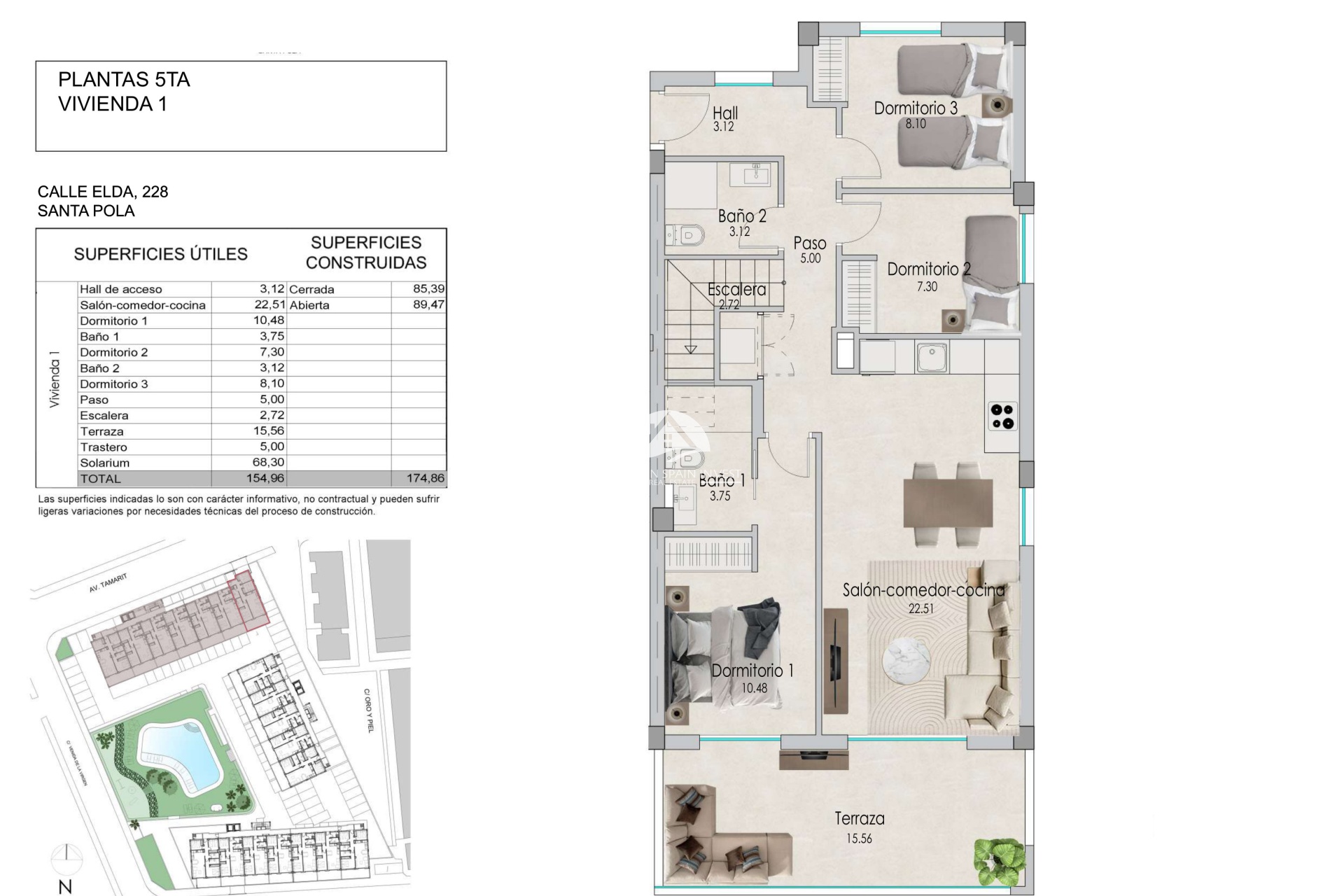 En el interior, las viviendas están diseñadas para ofrecer un espacio acogedor y funcional. Los apartamentos y áticos disponen de 2 o 3 dormitorios y 2 baños, adaptándose a diferentes necesidades familiares. La distribución incluye amplias terrazas, perfectas para disfrutar de las vistas y del clima templado de la región. Los acabados de calidad, como los suelos de cerámica y los armarios empotrados, aseguran un ambiente moderno y práctico, mientras que la posibilidad de contar con un solárium en algunas tipologías añade un valor adicional a la experiencia de vivir aquí.