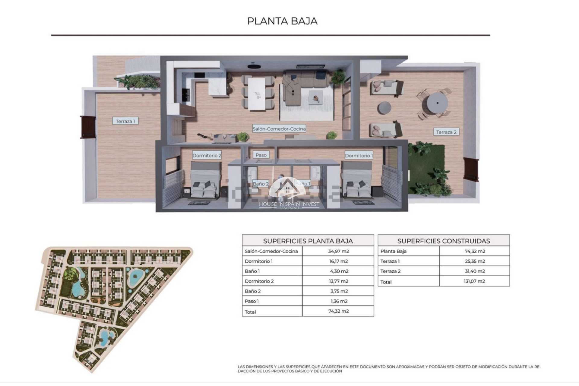 El interior de estas viviendas está diseñado con atención al detalle y funcionalidad. Los bungalows cuentan con dos dormitorios y dos baños, ofreciendo un espacio cómodo para familias o parejas. Los armarios empotrados proporcionan un almacenamiento eficiente, mientras que las persianas eléctricas y el video portero añaden un nivel de comodidad y seguridad. El suelo cerámico es una elección práctica y elegante, fácil de mantener y perfecto para el clima de la región. Además, la preinstalación de aire acondicionado asegura que los residentes puedan disfrutar de un ambiente interior confortable durante todo el año. La distribución incluye un garaje privado, lo que añade un nivel adicional de conveniencia para los propietarios de vehículos.