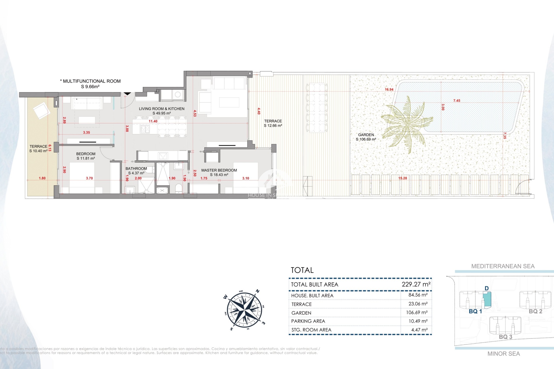 De buitenruimtes van deze residentie zijn ontworpen om optimaal te genieten van de natuurlijke omgeving. Elke woning heeft een privétuin, ideaal om buiten te ontspannen. De ruime terrassen bieden extra ruimte om te genieten van het uitzicht op zee en het mediterrane klimaat. Bovendien bevatten sommige typologieën een solarium, dat een exclusieve ruimte biedt om te zonnebaden of te genieten van rustige momenten. De locatie aan de eerste lijn van het strand zorgt ervoor dat bewoners kunnen genieten van de zeebries en ononderbroken uitzicht op de horizon.