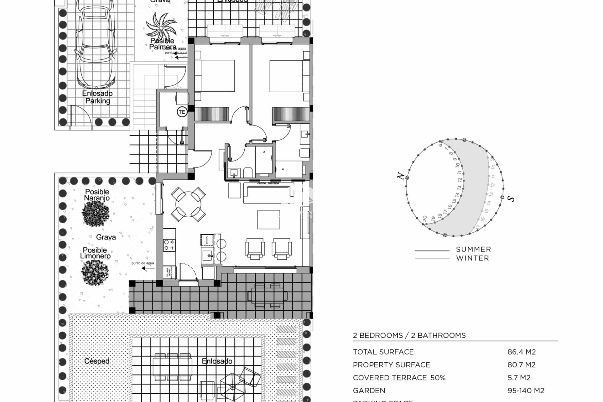 Het interieur van de bungalows is zorgvuldig ontworpen om comfort en stijl te bieden. Met twee slaapkamers en twee badkamers is elke ruimte geoptimaliseerd voor comfort. De vloeren van porseleinen tegels geven een moderne uitstraling en zijn gemakkelijk te onderhouden. Elektrische rolluiken en ingebouwde kasten zijn standaardkenmerken die de functionaliteit van het huis verbeteren. Bovendien zorgt de voorinstallatie van airconditioning ervoor dat het binnenklimaat altijd aangenaam is. De indeling omvat een garage, die een veilige plek voor het voertuig biedt.
