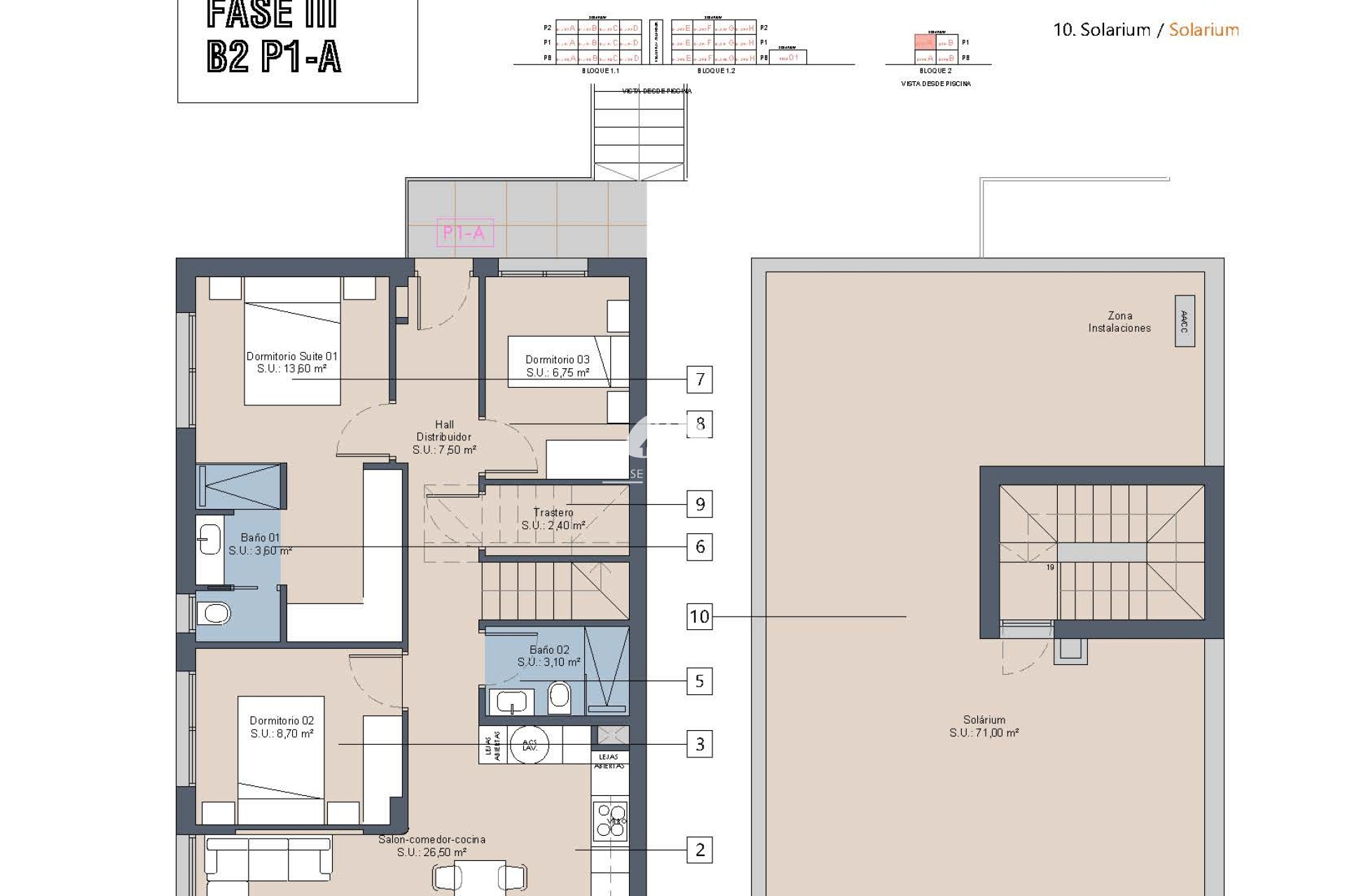 The exteriors of these bungalows are designed to maximize enjoyment of the Mediterranean climate. Each property features a private garden, perfect for creating a personal green space or enjoying outdoor moments. The spacious terraces offer an ideal place to relax, sunbathe, or enjoy outdoor meals with views of the natural surroundings. Additionally, the bungalows include a solarium, providing additional space for leisure and relaxation. A garage option is available for those who need it, ensuring vehicle comfort and security.