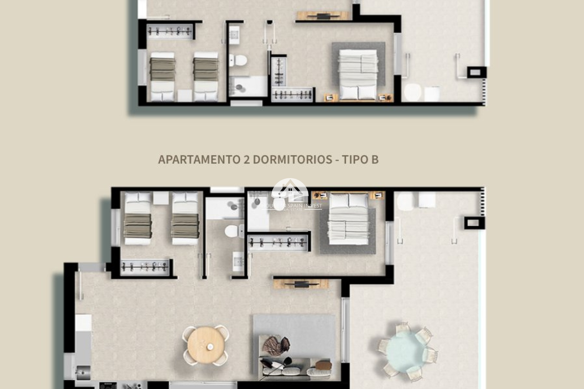 The interior of these homes is carefully designed to offer a modern and functional environment. Porcelain floors add a touch of elegance and durability, while electric shutters provide comfort and energy efficiency. Kitchens are equipped with high-quality appliances, making daily life easier. Built-in wardrobes optimize storage space, maintaining order and aesthetics. The layout includes options for 2 or 3 bedrooms and 2 or 3 bathrooms, adapting to different lifestyles.