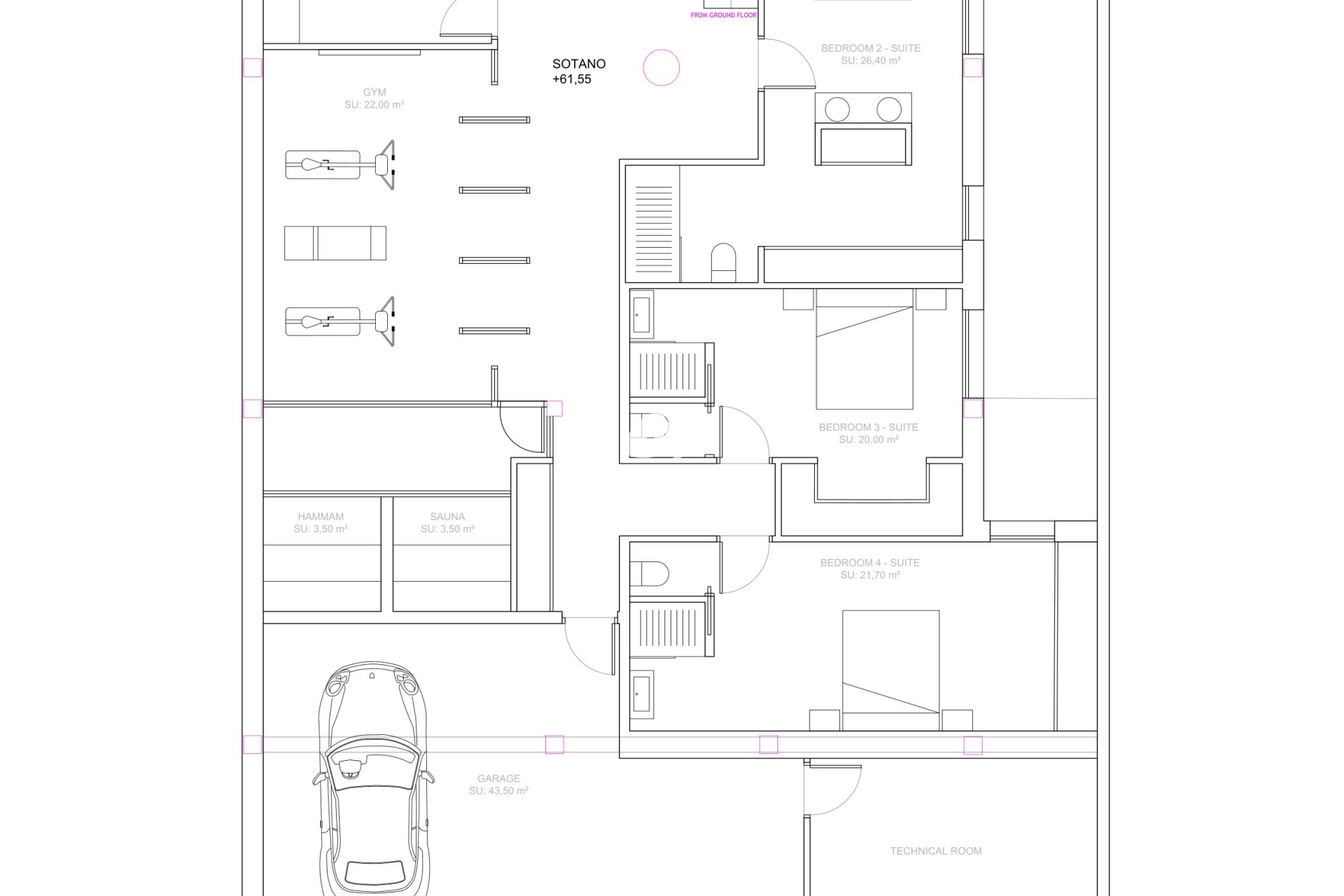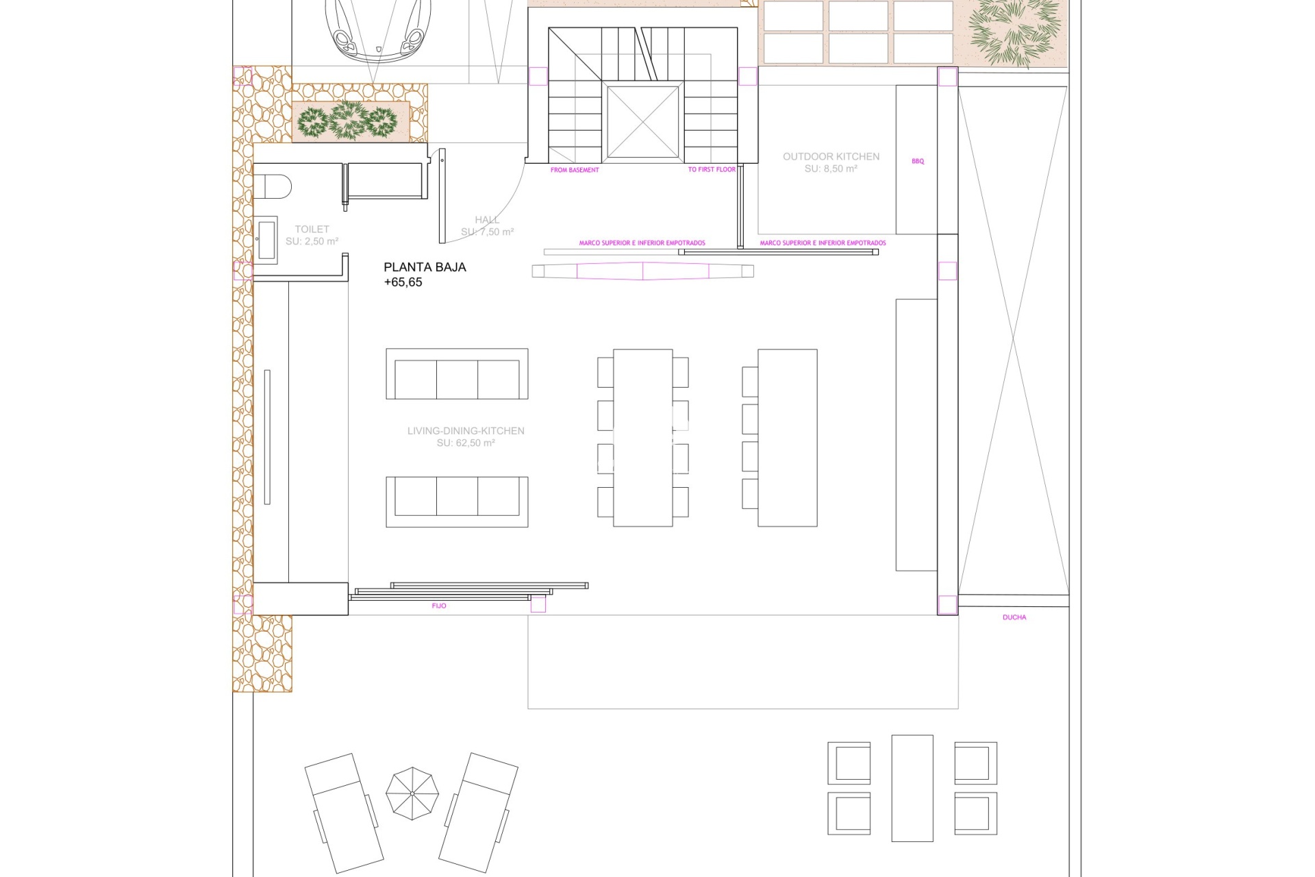 The interior of these villas in Rojales is designed to offer maximum comfort and functionality. Layout options include villas with 3, 4, or up to 6 bedrooms, adapting to the needs of different families. The bathrooms, ranging from 3 to 5 depending on the type, are equipped to offer comfort and style. The interior spaces are designed to make the most of natural light, creating a warm and welcoming atmosphere. The arrangement of the rooms and common areas is designed to offer a smooth and comfortable living experience, with quality finishes that complement the modern design of the villas.