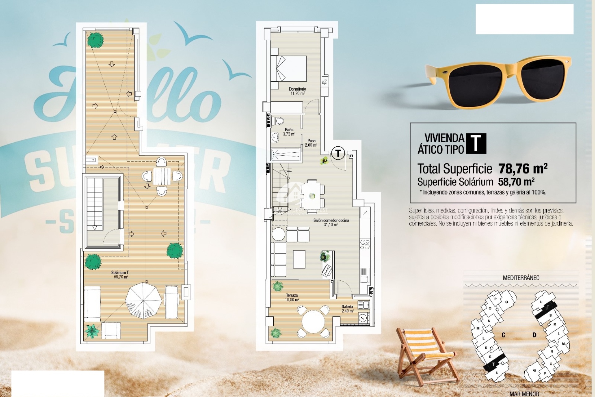 The exteriors of this residential complex in La Manga del Mar Menor are designed to offer an environment of tranquility and enjoyment. The residences feature private terraces, perfect for relaxing while overlooking the sea. Additionally, the penthouses have solariums, providing extra outdoor space to enjoy the Mediterranean climate. The communal garden areas add a touch of nature and freshness to the complex, creating a pleasant and welcoming atmosphere. The privileged location allows for sea views from various points of the complex, making every moment a unique experience.