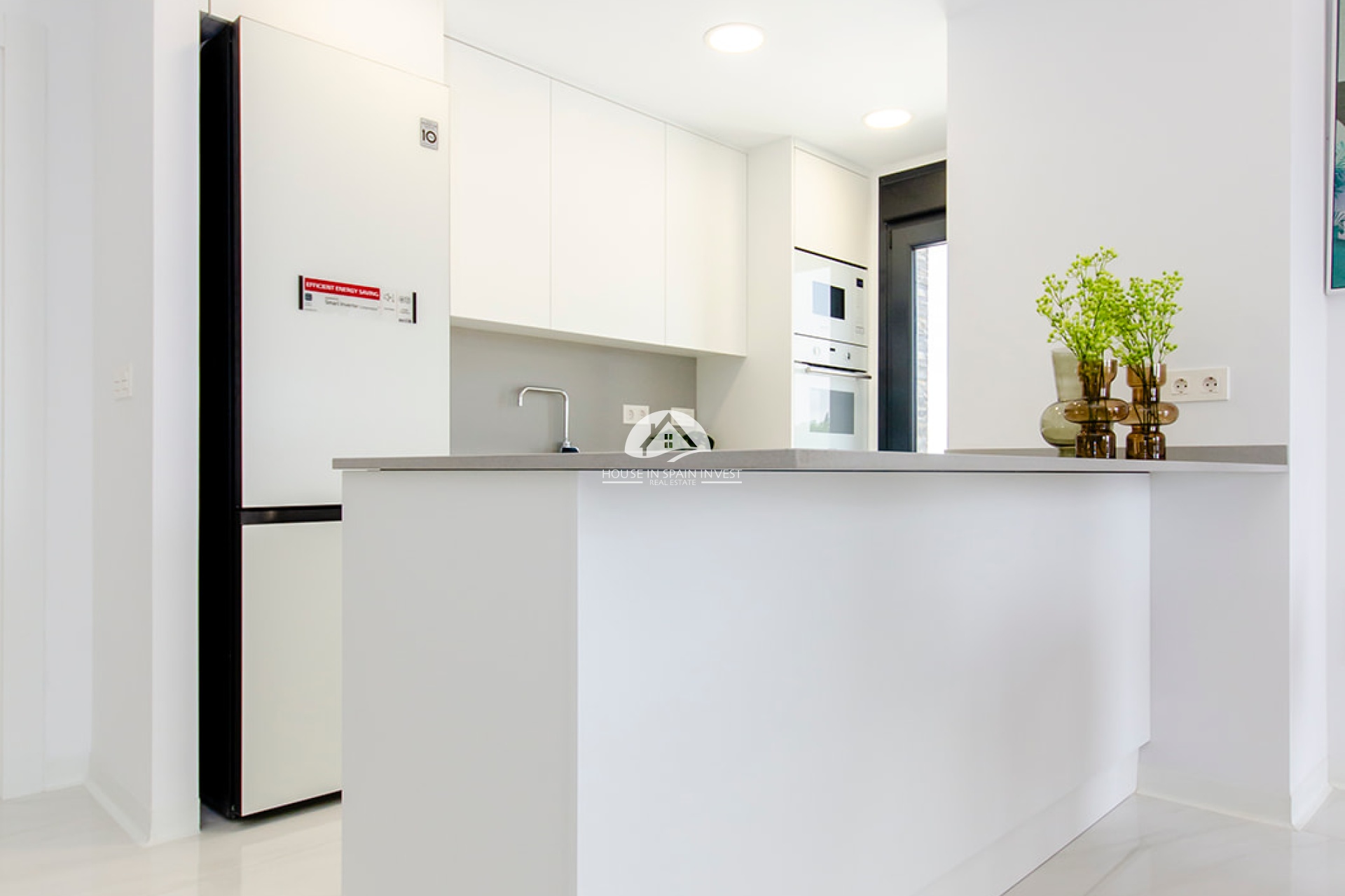 The interior of these homes in Orihuela is designed with a focus on comfort and functionality. Ceramic floors add a modern touch and are easy to maintain. The homes come fully furnished, making moving in easy and allowing enjoyment of the new home from day one. The kitchen is equipped with high-quality appliances, and the built-in wardrobes in the bedrooms offer ample storage space. The air conditioning system, along with additional pre-installation, ensures a pleasant environment throughout the year. Electric blinds and the video intercom add an extra level of comfort and security.