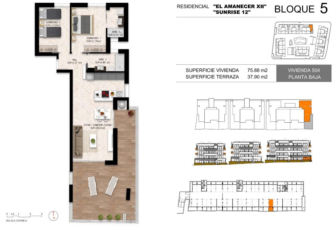 COMPLEJO RESIDENCIAL DE OBRA NUEVA EN LOS ALTOS Apartamentos y áticos modernos de nueva construcción totalmente equipados con cocina americana y salón, 2 dormitorios, 2 baños, amplias terrazas y bonitas zonas comunes en Los Altos. Puede elegir entre apartamentos en planta baja con jardín, apartamentos en planta media con acogedoras terrazas o apartamentos en planta alta con solarium privado, todos construidos con un alto estándar y muy buenas calidades. Los apartamentos se entregan con electrodomésticos, paquete de muebles, aire acondicionado instalado, mobiliario, plaza de aparcamiento y trastero. Hermosa comunidad cerrada que ofrece bonitas zonas verdes, piscina, sauna, gimnasio, jacuzzi, parque infantil y pista de petanca. Los Altos en Orihuela Costa está situado justo al sur de Torrevieja en la Costa Blanca en España. Los Altos se encuentra a sólo 10 minutos de las galardonadas playas de Orihuela Costa, el mayor centro comercial, La Zenia Boulevard o el conocido campo de golf de Villamartín. Los Altos está situado entre las capitales de las provincias de Alicante y Murcia. Los Altos está a 45 minutos del aeropuerto de Alicante y a 50 minutos del aeropuerto murciano de Corvera.
