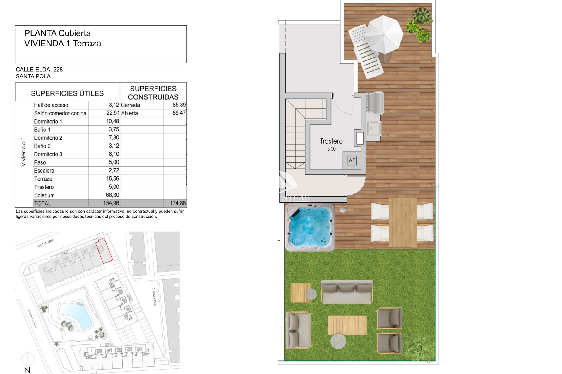 Los exteriores de este residencial en Santa Pola están pensados para maximizar el disfrute del entorno mediterráneo. Las propiedades cuentan con terrazas que ofrecen vistas al mar, ideales para relajarse al aire libre. Además, algunas tipologías incluyen solárium, proporcionando un espacio adicional para el ocio y el descanso bajo el sol. La inclusión de pérgolas y jacuzzis en ciertas unidades añade un toque de lujo y confort, permitiendo a los residentes disfrutar de momentos de relajación en la privacidad de su hogar.