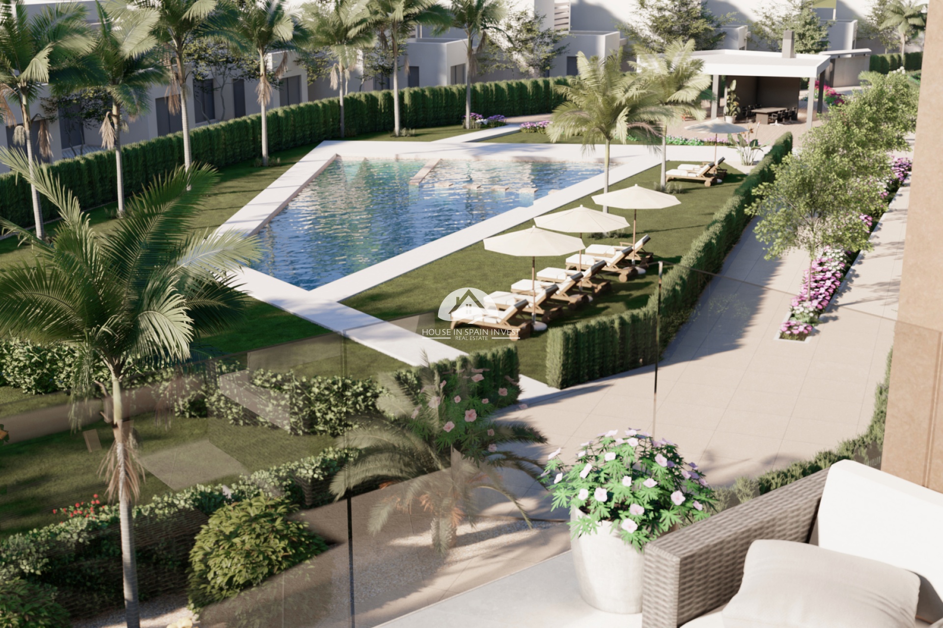 De buitenruimtes van dit residentiële complex zijn ontworpen om een aangename en functionele omgeving te bieden. De woningen beschikken over privéterrassen, ideaal om te genieten van het mediterrane klimaat en ontspannende momenten buiten. Daarnaast omvatten de gemeenschappelijke ruimtes goed onderhouden tuinen die een groene en rustige ruimte bieden voor alle bewoners. De aanwezigheid van een gemeenschappelijk zwembad voegt een vleugje luxe toe, waardoor men zich kan verfrissen en socialiseren in een veilige en gecontroleerde omgeving.
