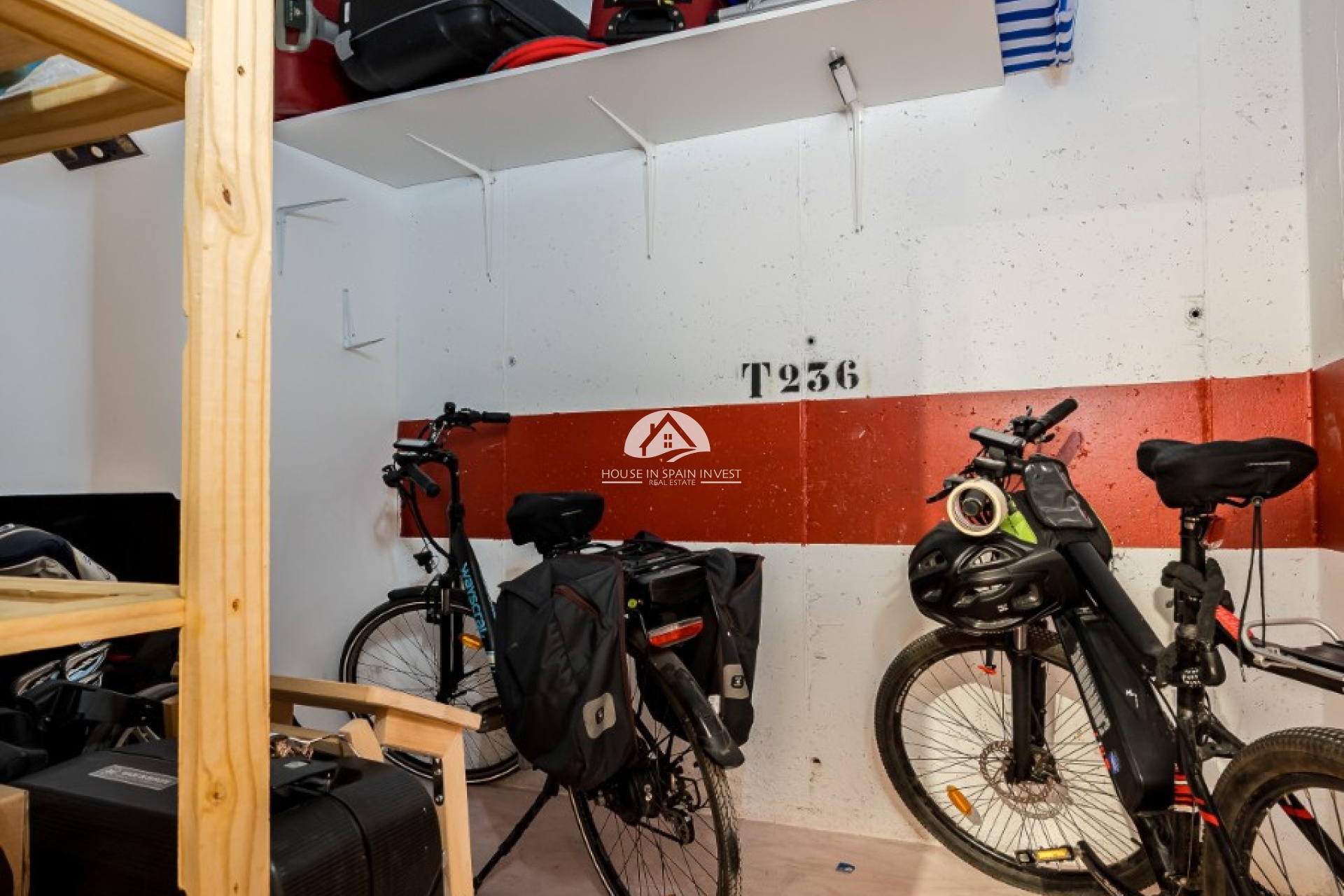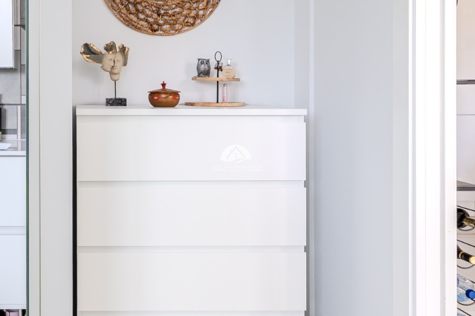 Stylish apartment with south-facing balcony and excellent communal facilities Welcome to a stylish and fully equipped apartment with a pleasant atmosphere and smart solutions. Here you will find a home with plenty of natural light, modern standards, and a layout that is both practical and inviting. The living room is bright and welcoming, with large windows letting in plenty of daylight. The room is nicely furnished and flows well into the kitchen, creating an open and airy feel. From the living room, you have access to the south-facing balcony, where you can enjoy the sun for most of the day. The kitchen has a modern design with clean lines and fully integrated appliances. It gives a neat and cohesive impression while being well suited for cooking and enjoying meals. Both bedrooms are generous in size with ample storage. The master bedroom has a French balcony, large wardrobes, and its own bathroom. Extra cupboards have also been installed to provide even more storage space. The second bedroom has large wardrobes and plenty of natural light, making it suitable as a guest room, office, or children’s room. The bathrooms are high-quality, with modern tiles and underfloor heating. The main bathroom has extra storage cabinets, and the ensuite bathroom in the master bedroom has a clean and elegant design. The apartment has central air conditioning, electric blinds, and underfloor heating in both bathrooms. It comes with a dedicated parking space in the underground garage and a storage room, which is fitted with shelves and practical storage solutions. The property is sold partially furnished. The community has a communal roof terrasse as well as a beautiful and well-maintained outdoor area with a swimming pool, boccia court, and green zones with palm trees and planting. Here you get a sense of tranquility and openness, while there are also excellent walking opportunities nearby. Daily services are easily accessible, and the area feels both safe and private. This is a well-designed and comfortable apartment with a high level of comfort – perfect for those seeking a modern home with attractive outdoor spaces and a sunny location. Dehesa de Campoamor is located in the south of Costa Blanca, in Orihuela Costa, and is known for its peaceful and green surroundings. The area has several beautiful beaches with clear water and good facilities, as well as a marina with moorings and water-related activities. Here you will find a good selection of restaurants, cafés, and local shops, while larger shopping centers such as La Zenia Boulevard are also within easy reach. The area also offers walking trails and parks for recreation, and has convenient access to the A7 motorway and Alicante-Elche airport.