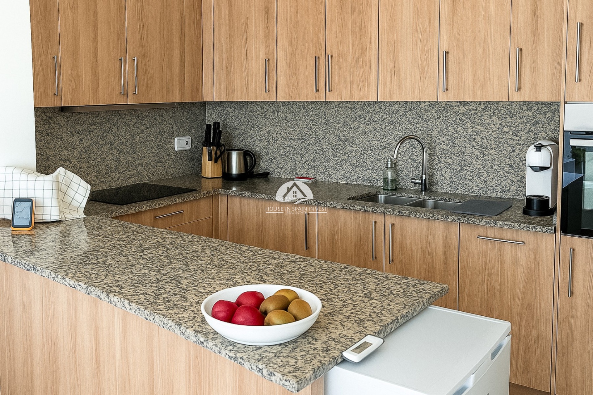 The main house features a spacious living and dining room , adjacent to a fully equipped open-plan kitchen with a dishwasher , oven , Siemens induction hob , and a large refrigerator . The kitchen has direct access to a large 150 m² terrace , ideal for enjoying the Mediterranean climate and the outdoors.