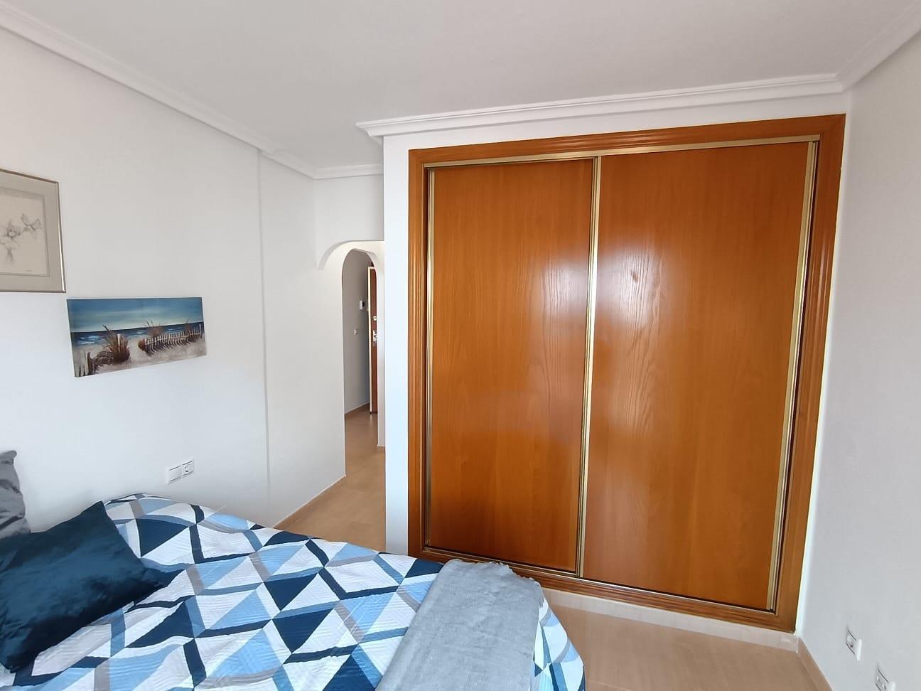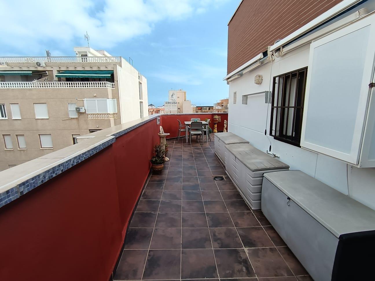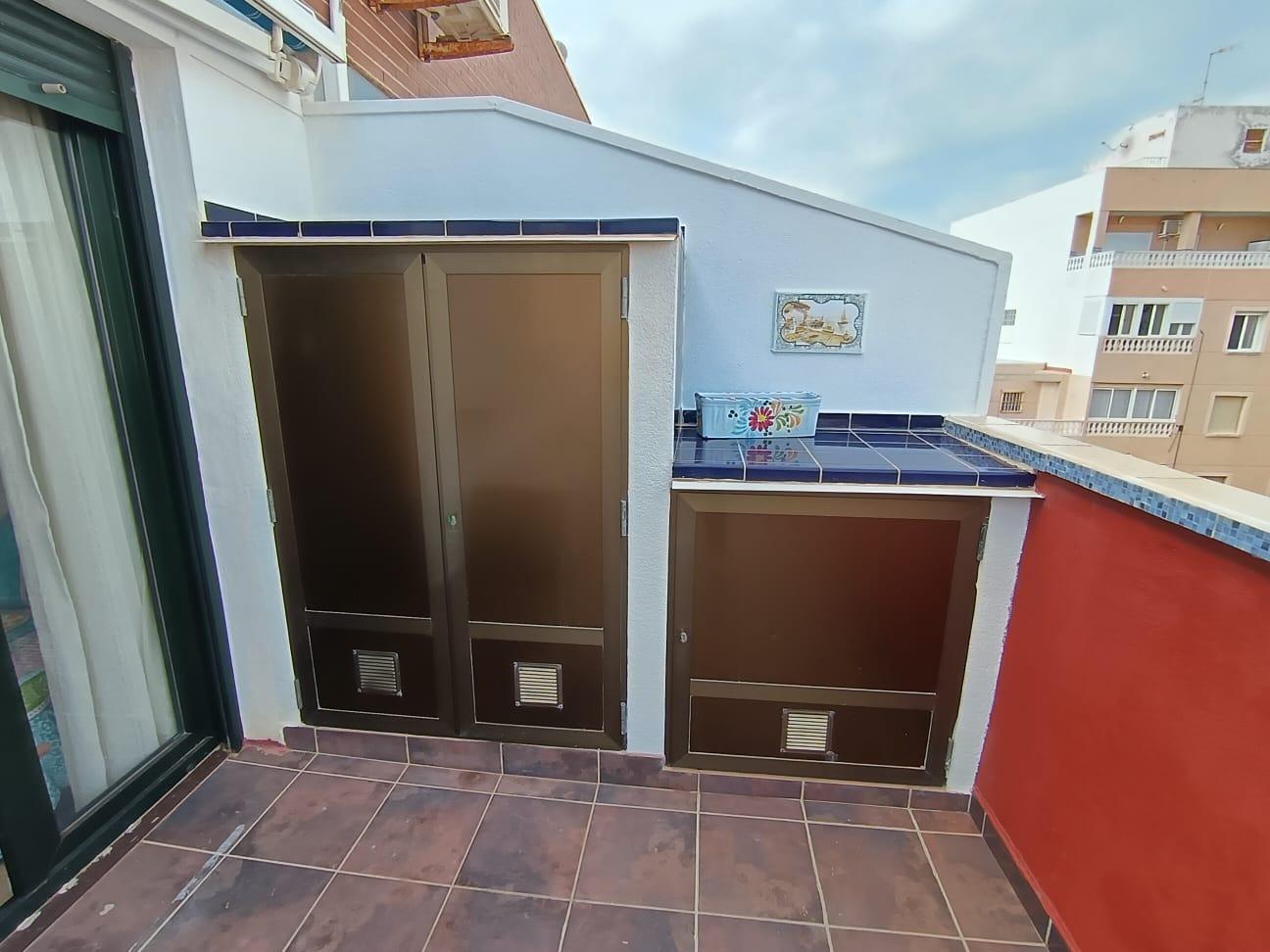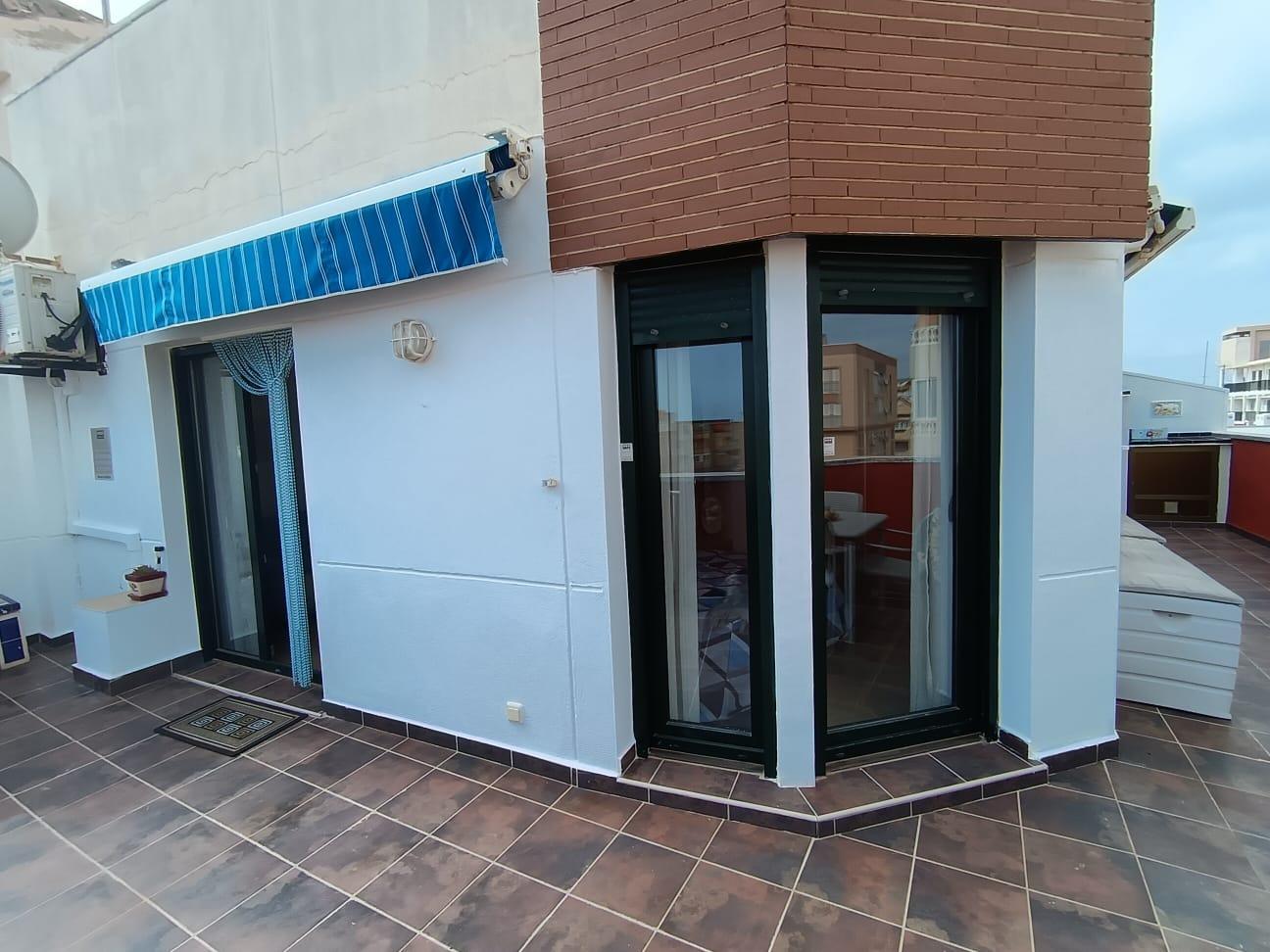 The penthouse lies on the fourth and last floor of a building with an elevator. The apartment comprises an entrance hall, two bedrooms, both with access to the corner terrace, one bathroom with a shower, an American plan fitted kitchen, and a bright living room with dining area. Adjacent lies a 30m² southeast-facing corner terrace with awnings and aluminum storage cabinets. A/C. La Mata beach lies 270m away.