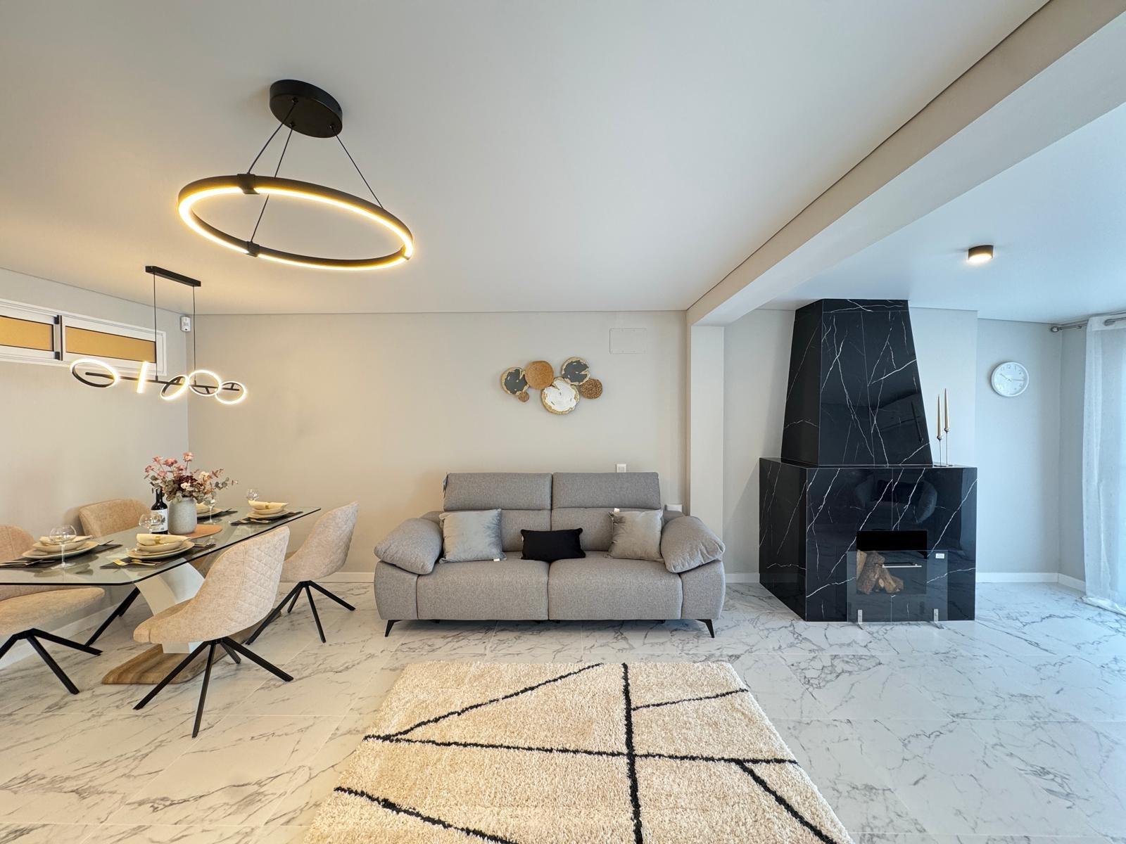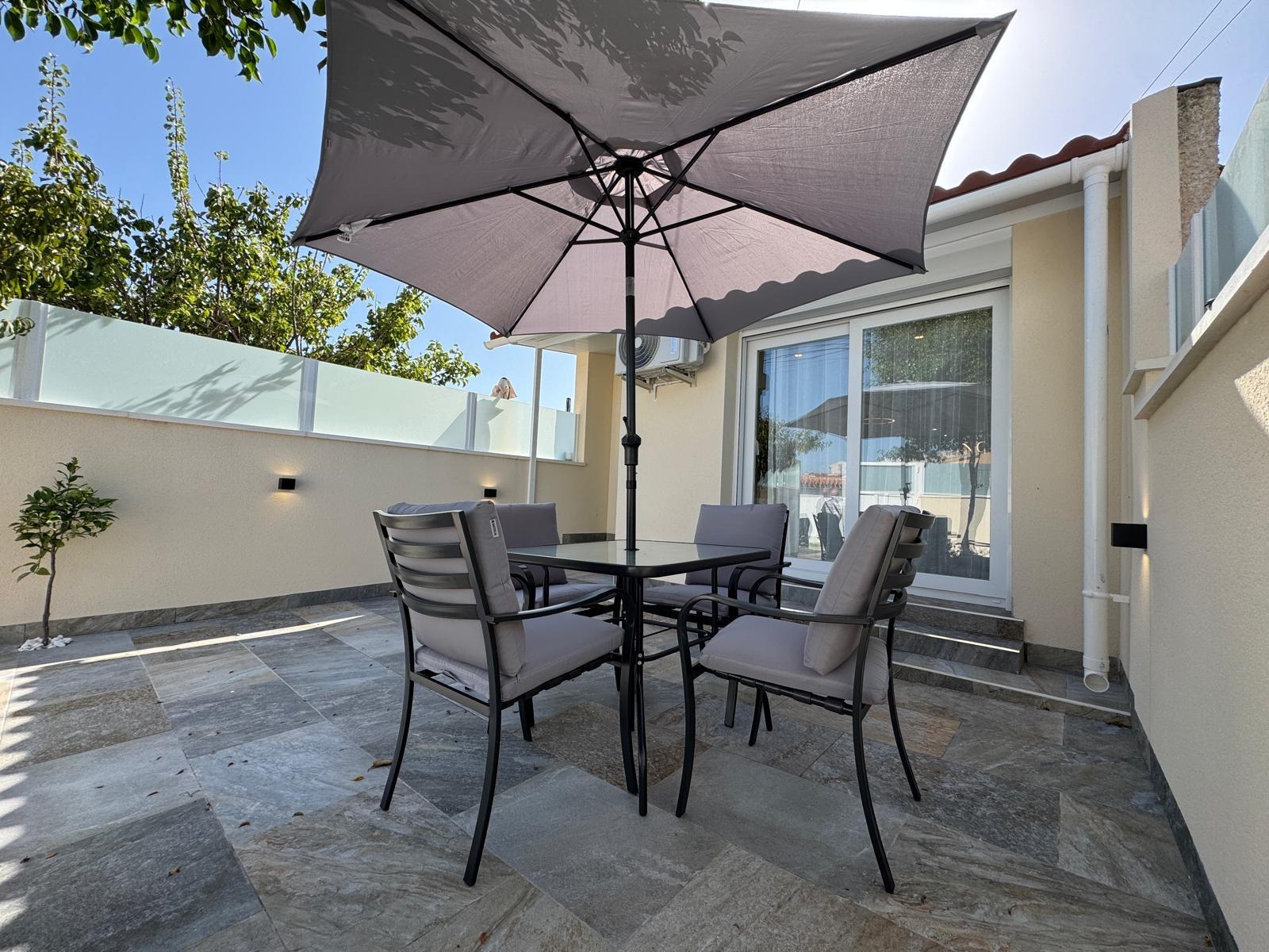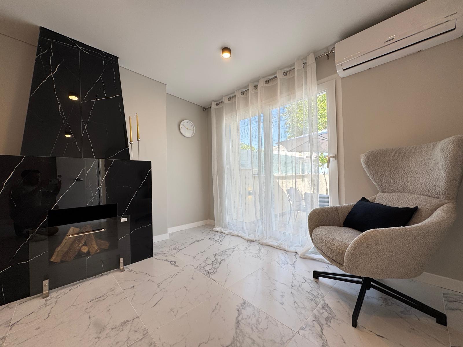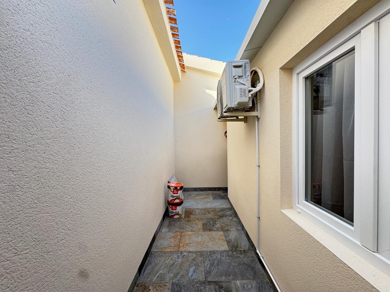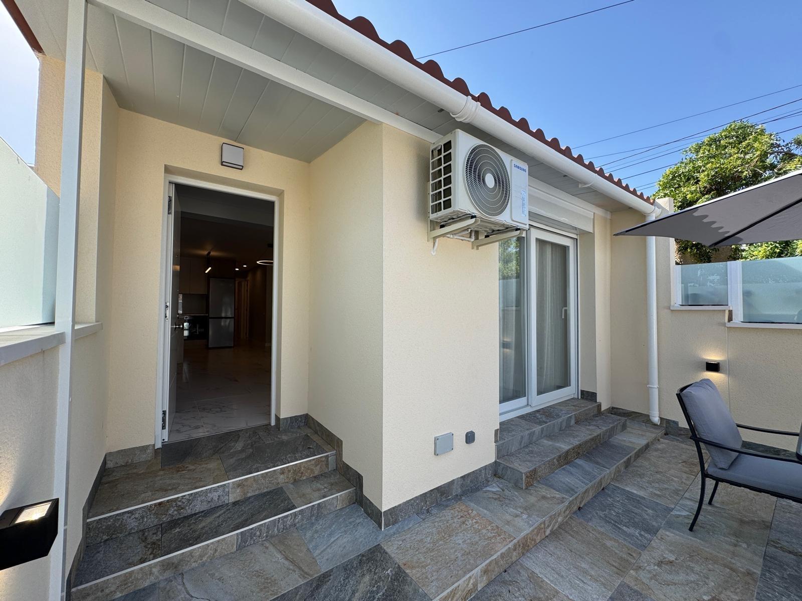 This elegantly renovated bungalow has a 40m2 tiled front terrace with seating and sun areas and parking for a car.
