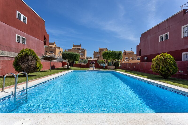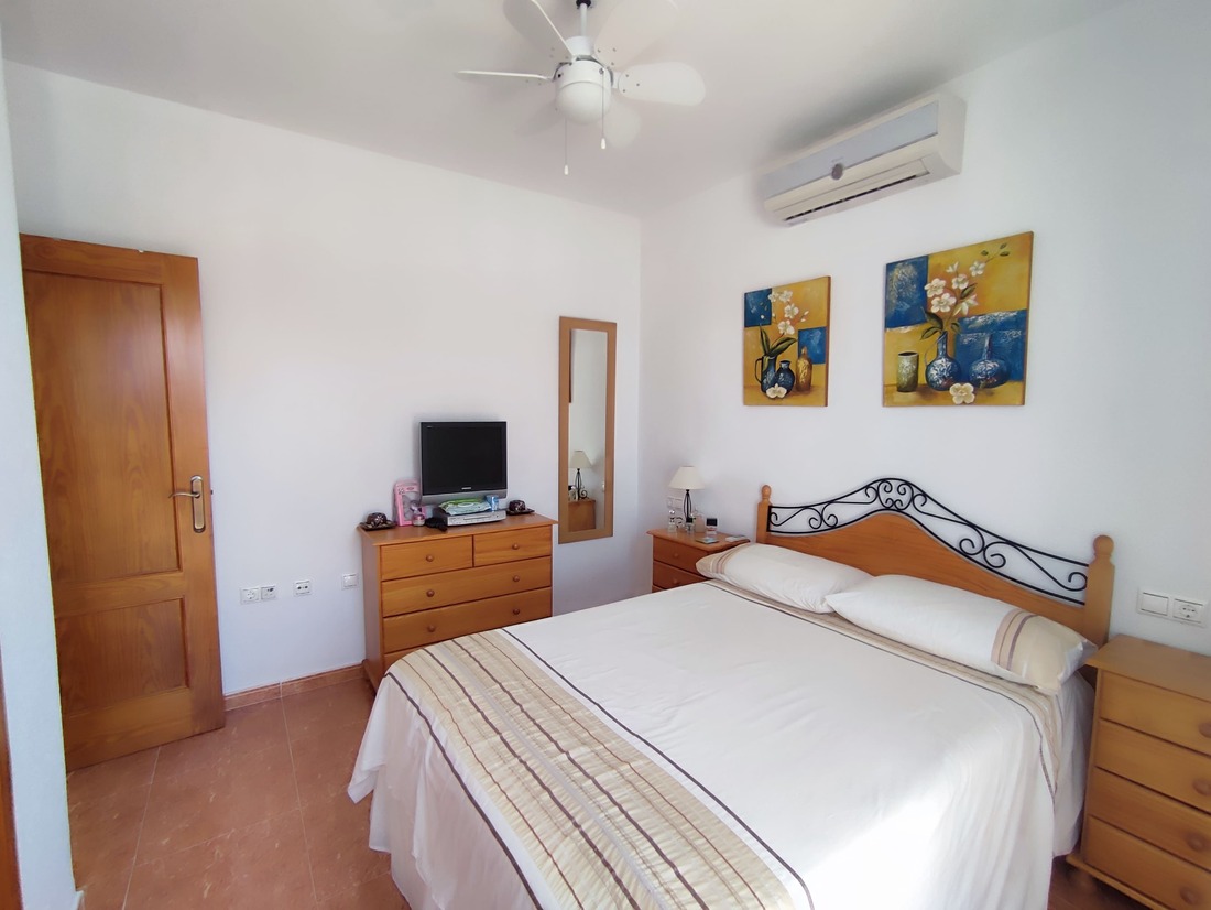 This beautiful, well maintained corner house has 3 bedrooms and 2 bathrooms. On the ground floor you will find the living room with dining area, a separate equipped kitchen with door to the outside, a bedroom and a bathroom with shower. On the first floor there are 2 bedrooms and a bathroom. The master bedroom has direct access to a spacious terrace. On the first floor, a staircase leads to the amazing roof terrace with beautiful view of the area. A/C. Sold furnished.
