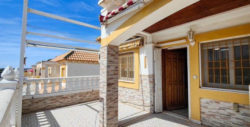 Top floor bungalow with private roof terrace and a large front terrace overlooking the communal swimming pool for sale in Urb. Parque de las Naciones, Torrevieja.