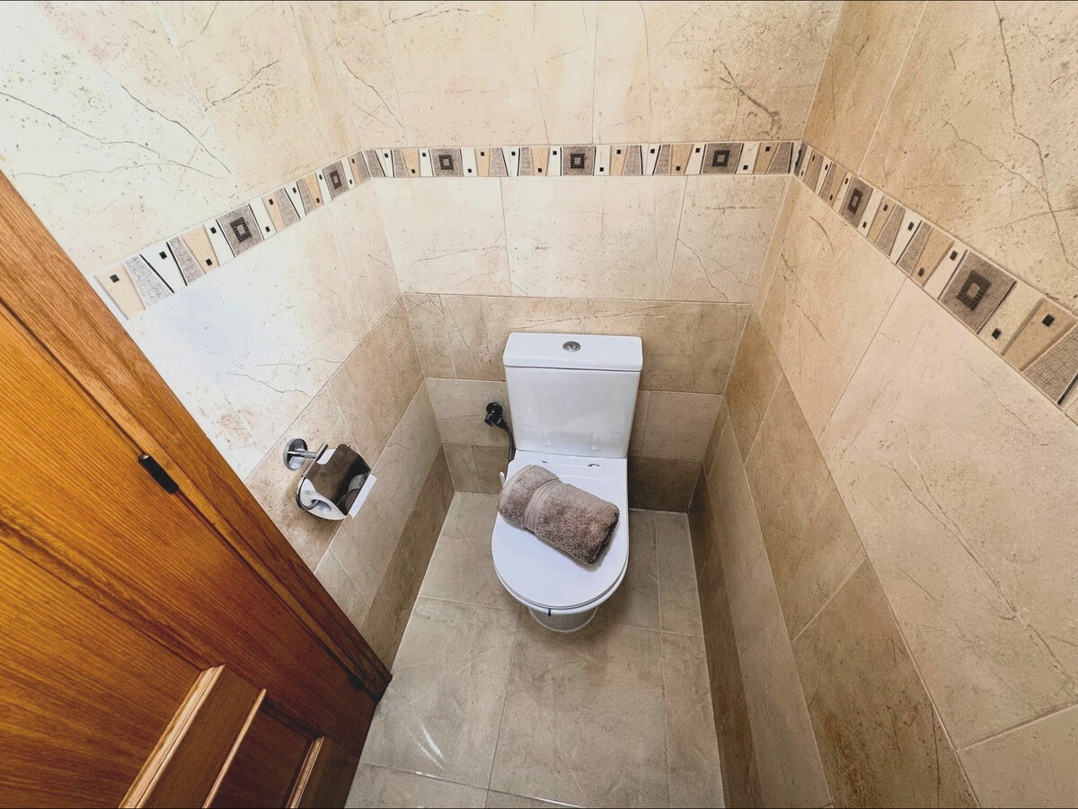 The apartment lies on the first floor of a building with an elevator. It features an entrance hall, two bedrooms, a bathroom with a walk-in shower, a guest toilet, an American fitted kitchen, a bright living room with a dining area, and a cozy terrace. Sold furnished.